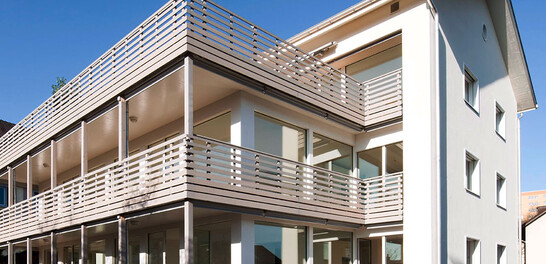 The basis In the course of a total renovation apartments were extended by an addition in wood. The resulting living space with a veranda represents an added value for the apartments on the first floor and 1st floor. Two inviting terraces were created on the new flat roof area, which belong to the apartments on the 2nd floor. With a prefabricated new outer shell, the building was upgraded to Minergie-P standard. As a first step, all balconies protruding from the facade, window jambs canopies, local and gable side had to be cut back to wall level. New strip supports were created to connect the timber building elements to the existing façade.