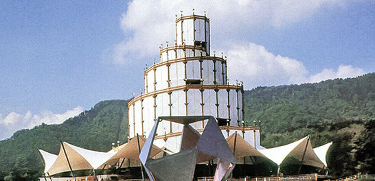 The round 12-story wooden exhibition tower, diameter and height 50 m each, formed the antipole to the high-tech tents of the exhibition. A skeleton with circularly arranged masts and semicircular tongs was chosen as the main supporting structure. For the connection of the tongs, a new type of heavy-duty fastener had to be developed, which had to meet high demands with requirements such as load-bearing capacity, flexibility (round timber) and low-cost procurement. Wood can certainly be used for more than just archaic structures, yet here it was the welcome backdrop for a historical research exhibition.