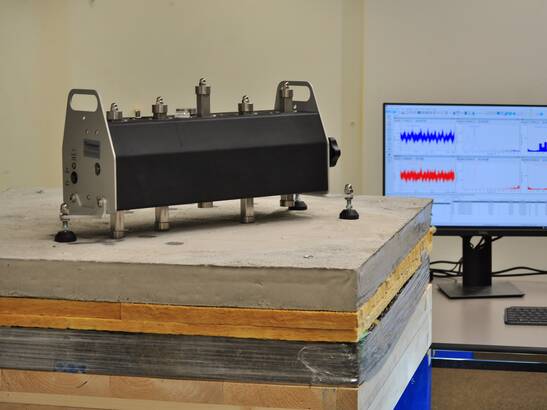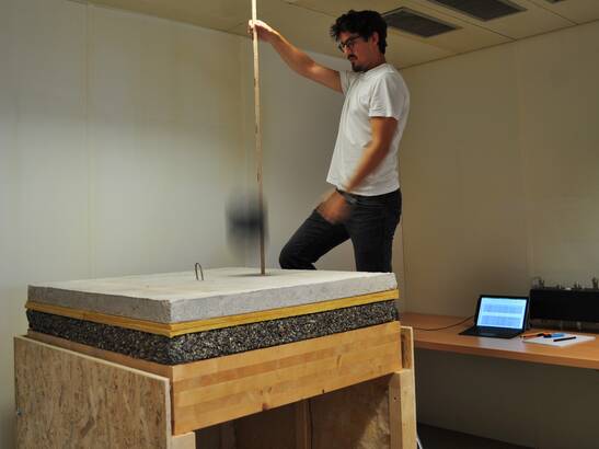 We test innovative floor structures with comparative measurements for our customers in our impact sound test bench. The impact sound test bench is the result of several bachelor theses at the Bern University of Applied Sciences in Biel.